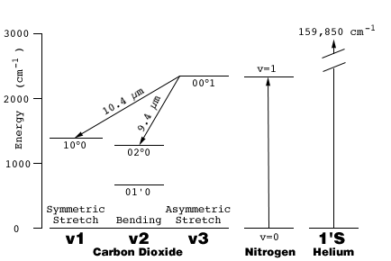 The standard carbon dioxide cycle starts by pumping nitrogen to an excited vibrational state (stretch, v=1, 2, 3, or 4). At v=1 nitrogen is only 18 1/cm below carbon dioxide's 00 ° 1 state, thermal energy bridges the gap. The energy is transferred to the carbon dioxide since the decay of a nitrogen, a homonuclear molecule, by radiative transition is forbidden. From the 00 ° 1 energy level carbon dioxide transitions by stimulated emission to either the 10 ° 0 or 02 ° 0 energy levels.